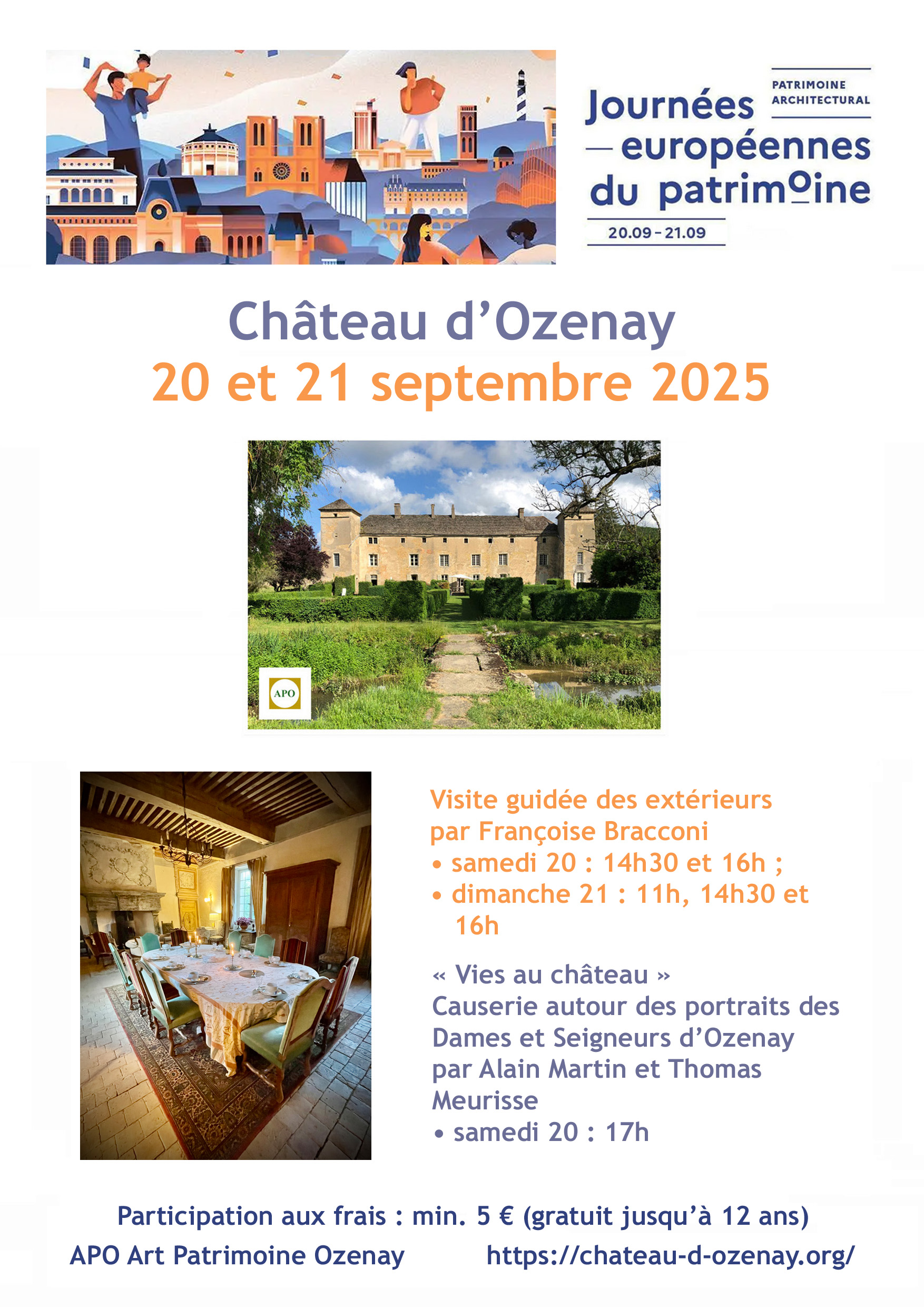 L’association Art Patrimoine Ozenay (APO) est une association « loi 1901 », à but non lucratif et animée par des bénévoles. Elle vise à accroître, par des activités culturelles de tous ordres, le rayonnement du village d’Ozenay, en particulier de son château.